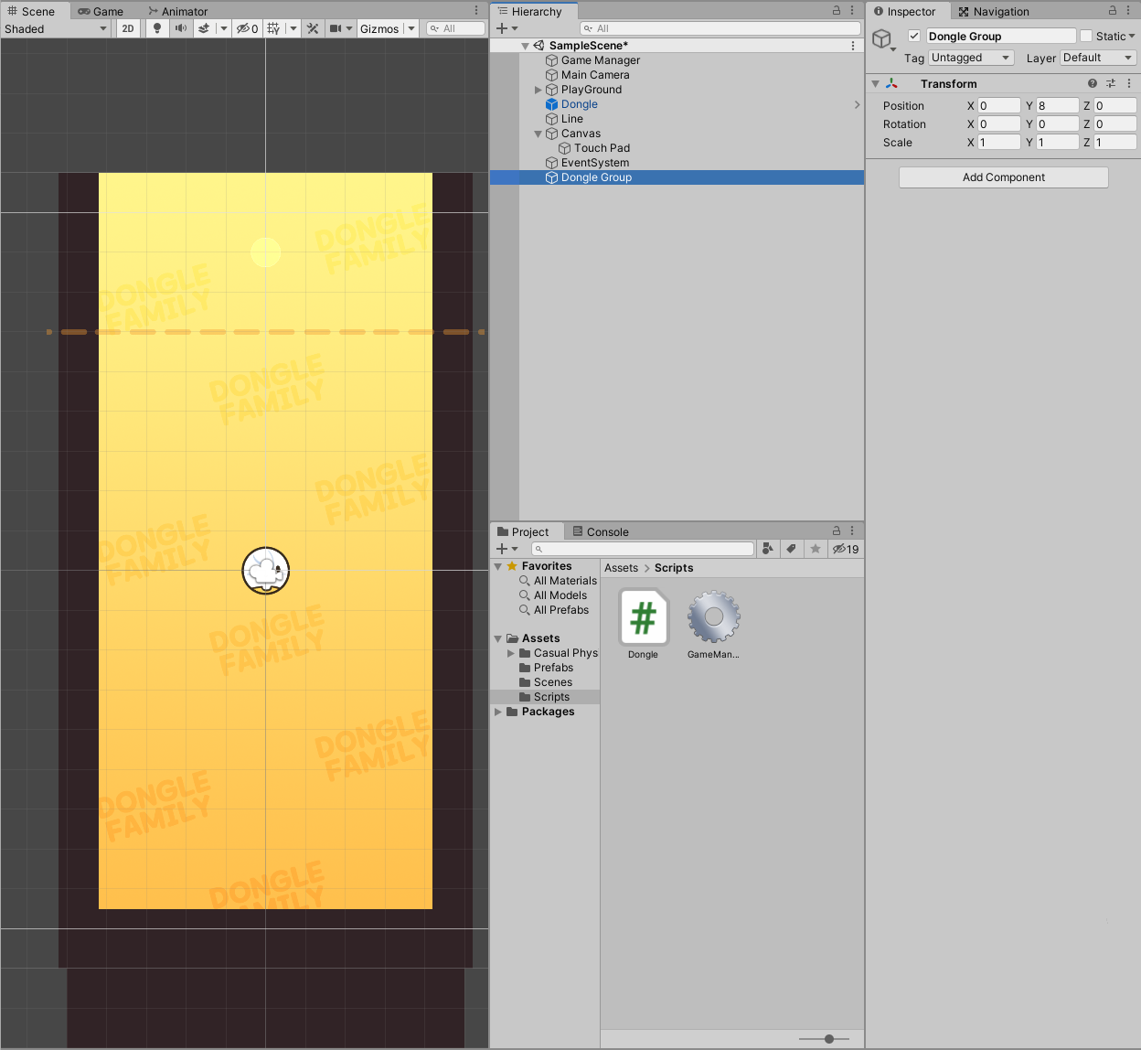 - Dongle 스크립트 파일에서는 애니메이션과 연결해주었고, 매개변수 Level의 값을 전달해주도록 추가했다. GameManager 스크립트 파일에서는 tagetFrameRate로 프레임을 관리해주고, Dongle의 레벨을 0~7까지 랜덤하게 지정해서 동글을 활성화해준다.