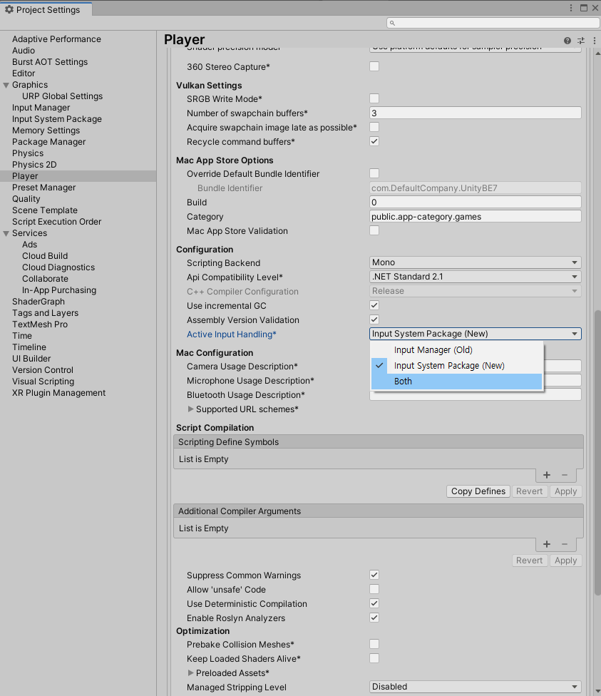 - 댓글을 보니까 새로운 입력 시스템을 사용해서 발생한 에러인듯하다. 프로젝트 세팅을 예전 버전과 동시에 사용하는 것으로 바꿔주면 된다고 한다.