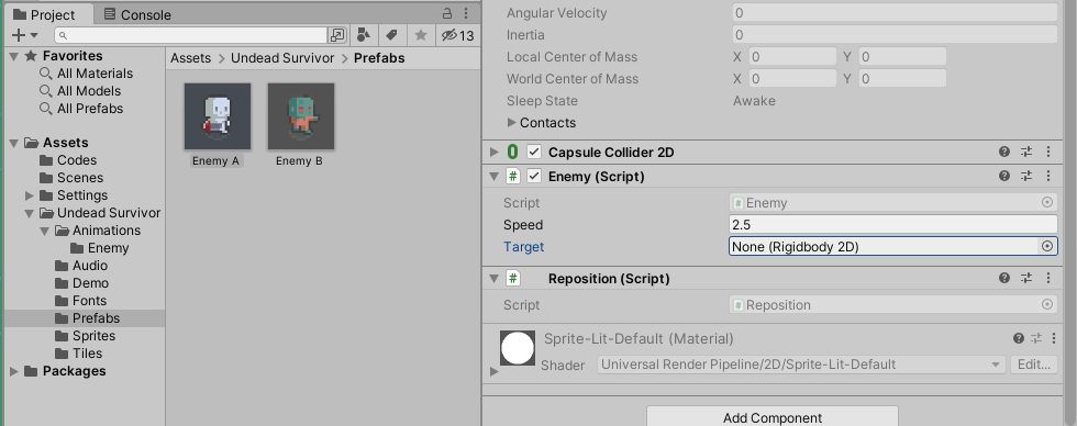 - 따라서 Enemy 스크립트에 생성되었을 때 Player를 Target으로 할 수 있게 변경해야한다.