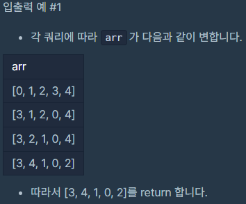 정수 배열 arr와 2차원 정수 배열 queries이 주어집니다. queries의 원소는 각각 하나의 query를 나타내며, [i, j] 꼴입니다.