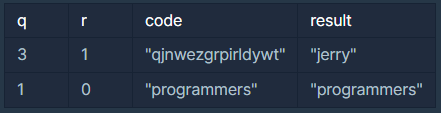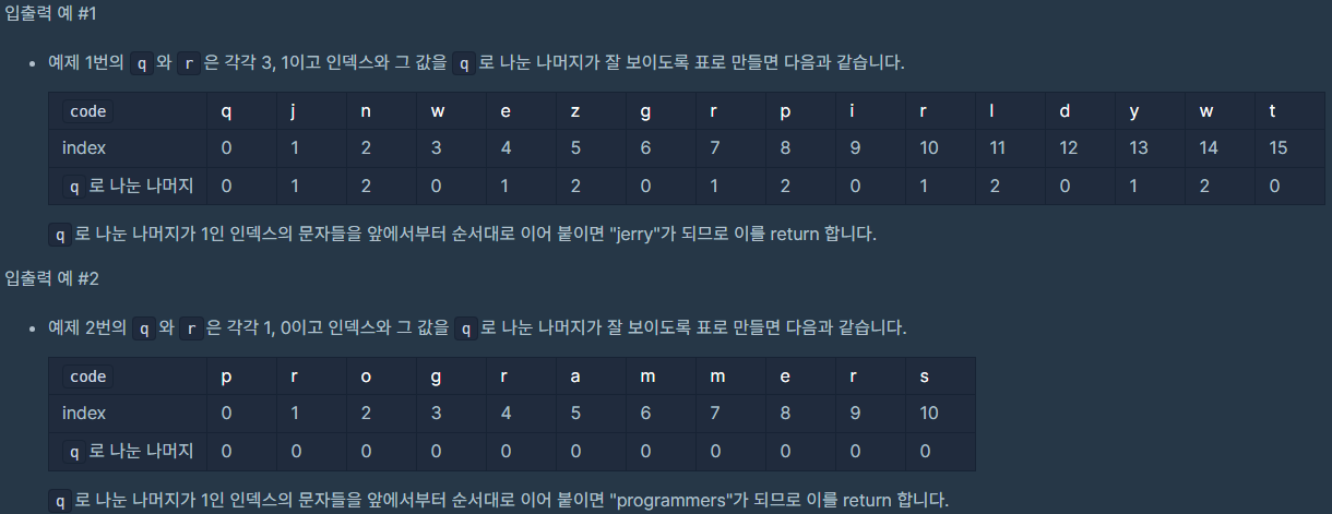 두 정수 q, r과 문자열 code가 주어질 때, code의 각 인덱스를 q로 나누었을 때 나머지가 r인 위치의 문자를 앞에서부터 순서대로 이어 붙인 문자열을 return 하는 solution 함수를 작성해 주세요.