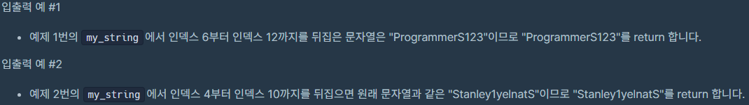 문자열 my_string과 정수 s, e가 매개변수로 주어질 때, my_string에서 인덱스 s부터 인덱스 e까지를 뒤집은 문자열을 return 하는 solution 함수를 작성해 주세요.