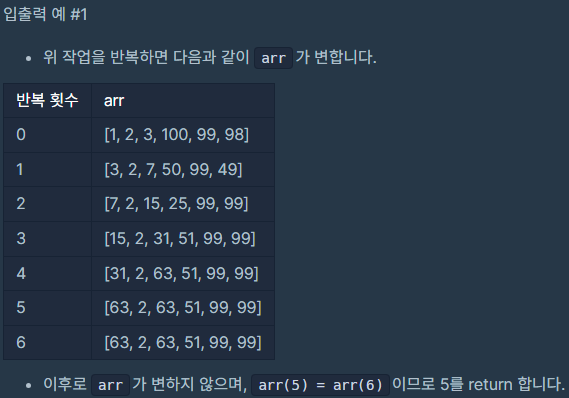 이러한 작업을 x번 반복한 결과인 배열을 arr(x)라고 표현했을 때, arr(x) = arr(x + 1)인 x가 항상 존재합니다.