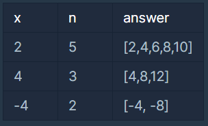 함수 solution은 정수 x와 자연수 n을 입력 받아, x부터 시작해 x씩 증가하는 숫자를 n개 지니는 리스트를 리턴해야 합니다.
