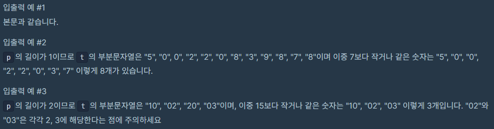 숫자로 이루어진 문자열 t와 p가 주어질 때, t에서 p와 길이가 같은 부분문자열 중에서, 이 부분문자열이 나타내는 수가 p가 나타내는 수보다 작거나 같은 것이 나오는 횟수를 return하는 함수 solution을 완성하세요.