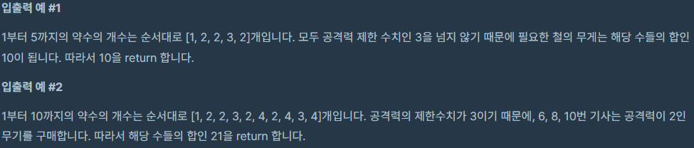 각 기사는 자신의 기사 번호의 약수 개수에 해당하는 공격력을 가진 무기를 구매하려 합니다.