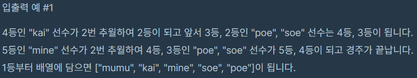 선수들의 이름이 1등부터 현재 등수 순서대로 담긴 문자열 배열 players와 해설진이 부른 이름을 담은 문자열 배열 callings가 매개변수로 주어질 때, 경주가 끝났을 때 선수들의 이름을 1등부터 등수 순서대로 배열에 담아 return 하는 solution 함수를 완성해주세요.